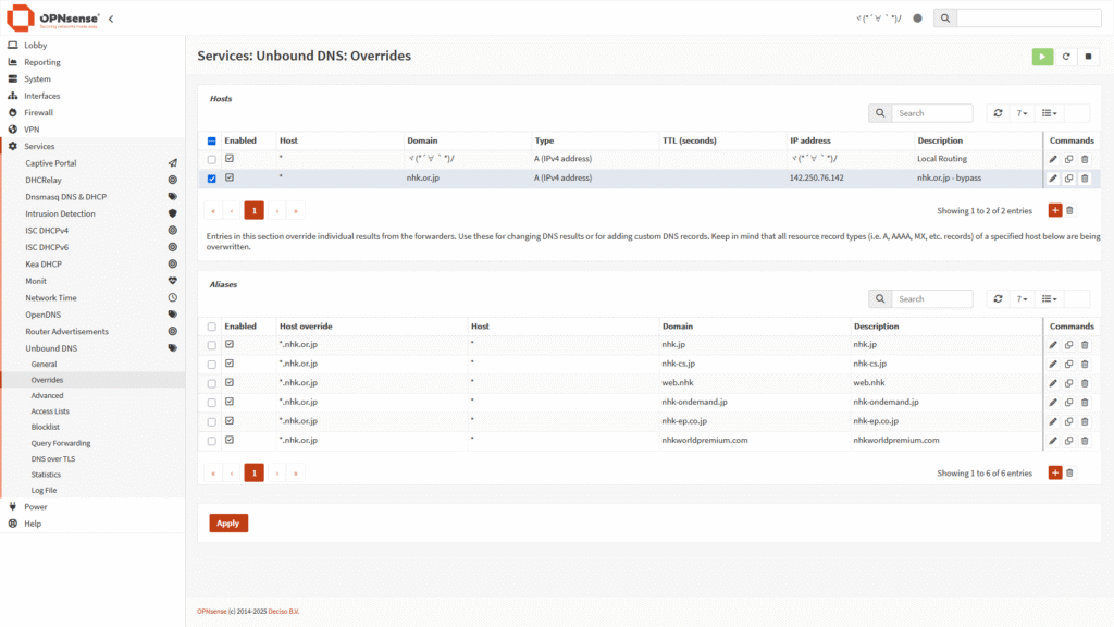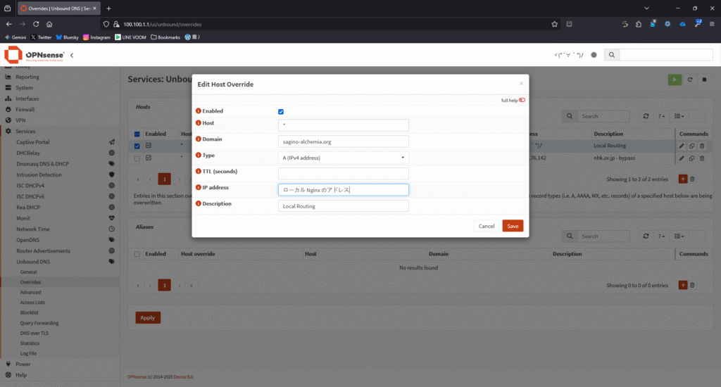 折角 OPNsense を建てたので、 DNS Override もしておく。