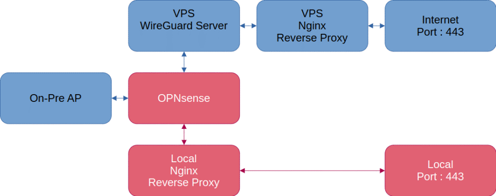 そこで本題。ローカル環境からは、 sagino-alchemia.org を VPS サーバーに向けず、ローカル内最短経路でルートしてしまおうという設定。今回は、ローカルサービスをまとめるために Nginx を Docker で構築。勿論、 OPNsense WAF を使わないなどあれば、フロントに BunkerWeb などを配置しても良さそう。
