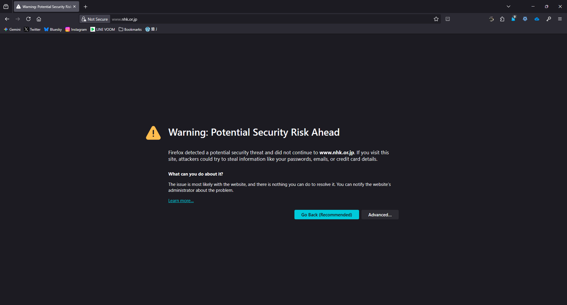 下段の Aliases は、上段のルールと同じように適用するドメインを指定することで、複数ドメインに対応可能。ちなみにリダイレクトしているアドレス、 142.250.76.142は Google のアドレスなので、 404 が返ってくる。勿論、自分のサイトのアクセス禁止ページに向けても OK. 但しこの場合、証明書が一致しないので、エラーになって、 Firefox 的には警告が出る。