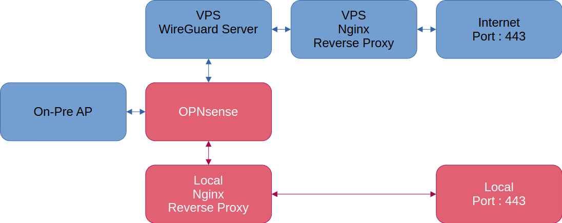 このとき、ローカルから自分のドメインにアクセスすると、図の右側、一旦 Nginx のリバースプロキシから入り、 WireGuard を通過し、オンプレ AP サーバーに到達するという遠回りを強いられる上、現在の回線が Docomo Home 5G (環境が悪く、実質 4G)という上り一桁台の貧弱回線なので、自分のサーバーにアクセスするのがストレスという事態になってしまっていた。いくら仮設環境とはいえ、流石に我慢できなくなったというのが今回の話。
